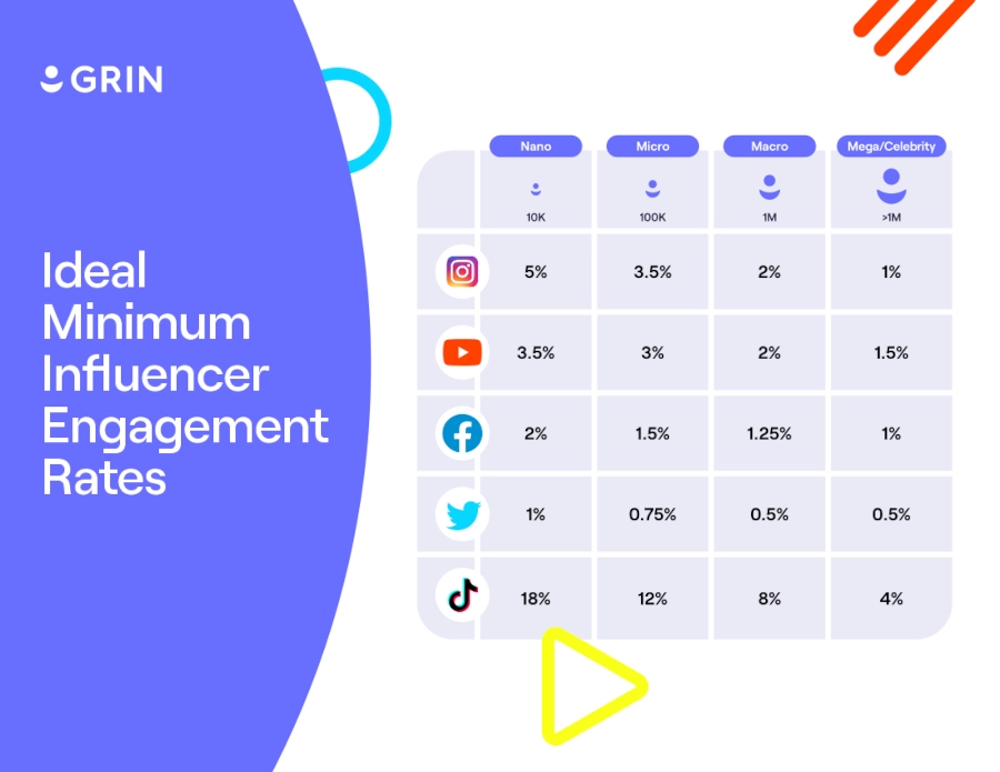 Or, you can use a tool like the GRIN Web Extension to calculate engagement rates automatically—no math required. Check out the chart below for guidance on what an ideal engagement rate looks like for each major platform.